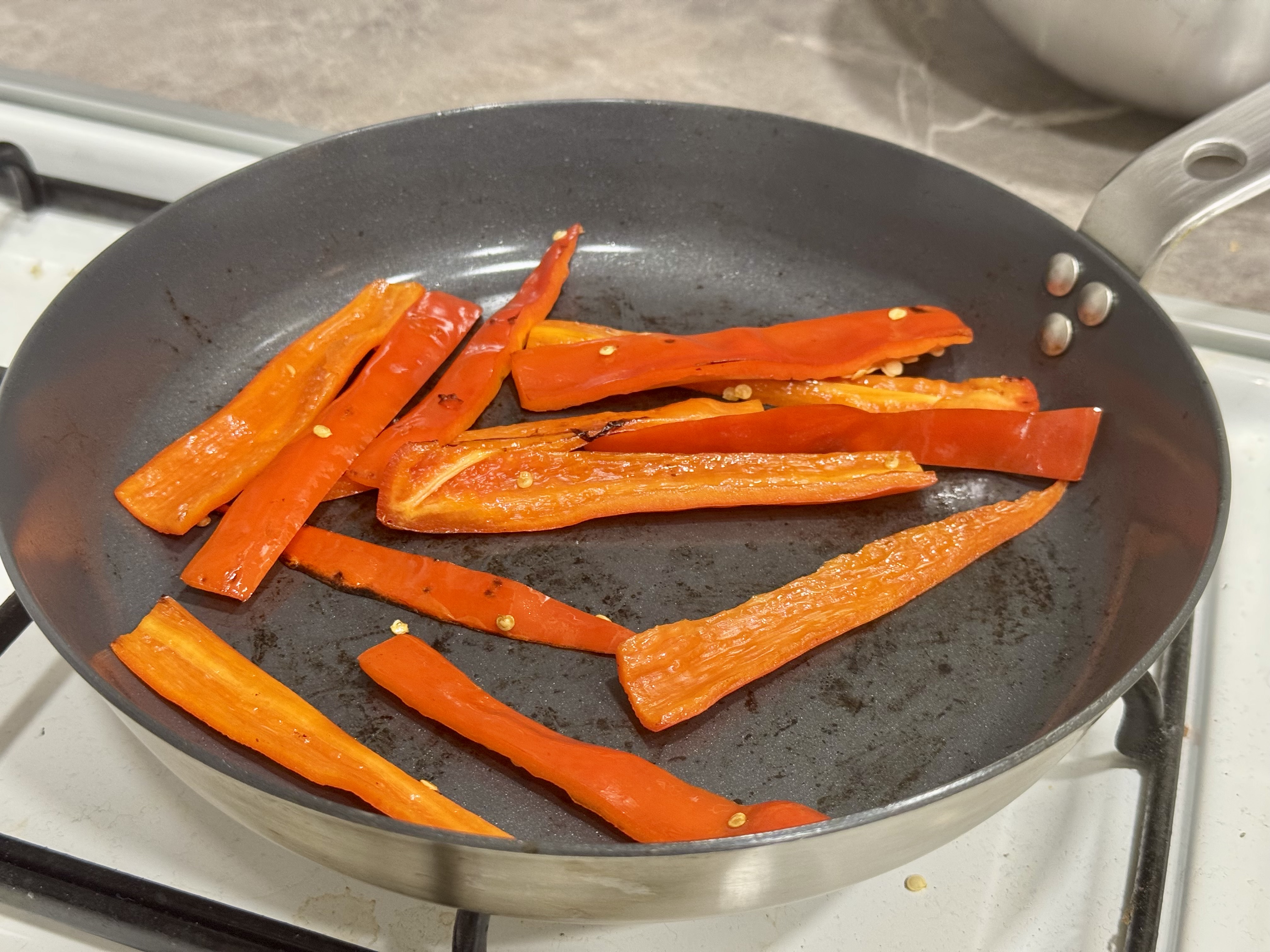 Paprika se nakrájí na plátky a zprudka opeče na pánvi. Jestli se paprika moc připaluje, přidejte trochu vody nebo oleje.