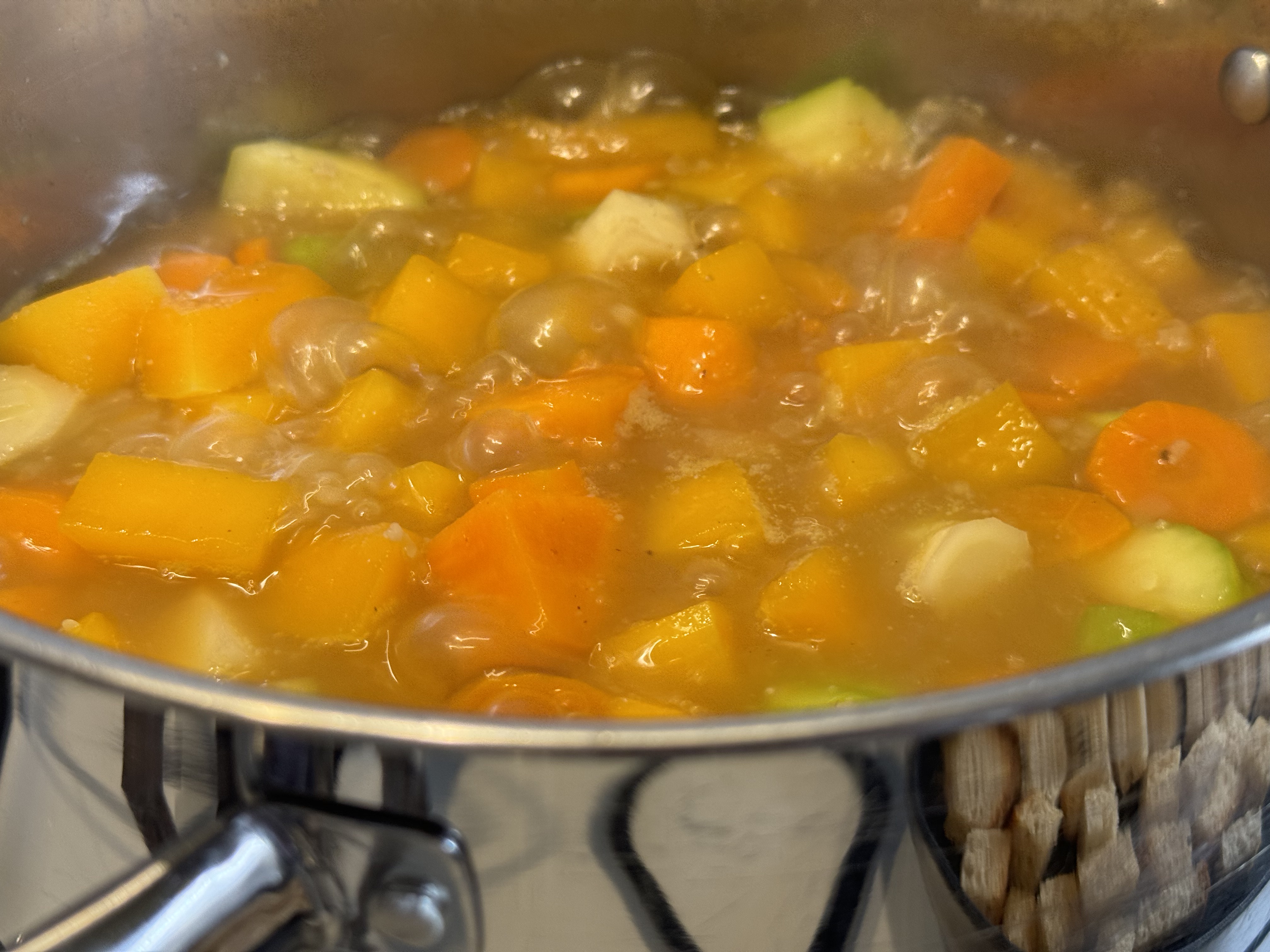 Poté přidáme nakrájenou zeleninu a dýni. Zalijeme vodou a vaříme do měkka.