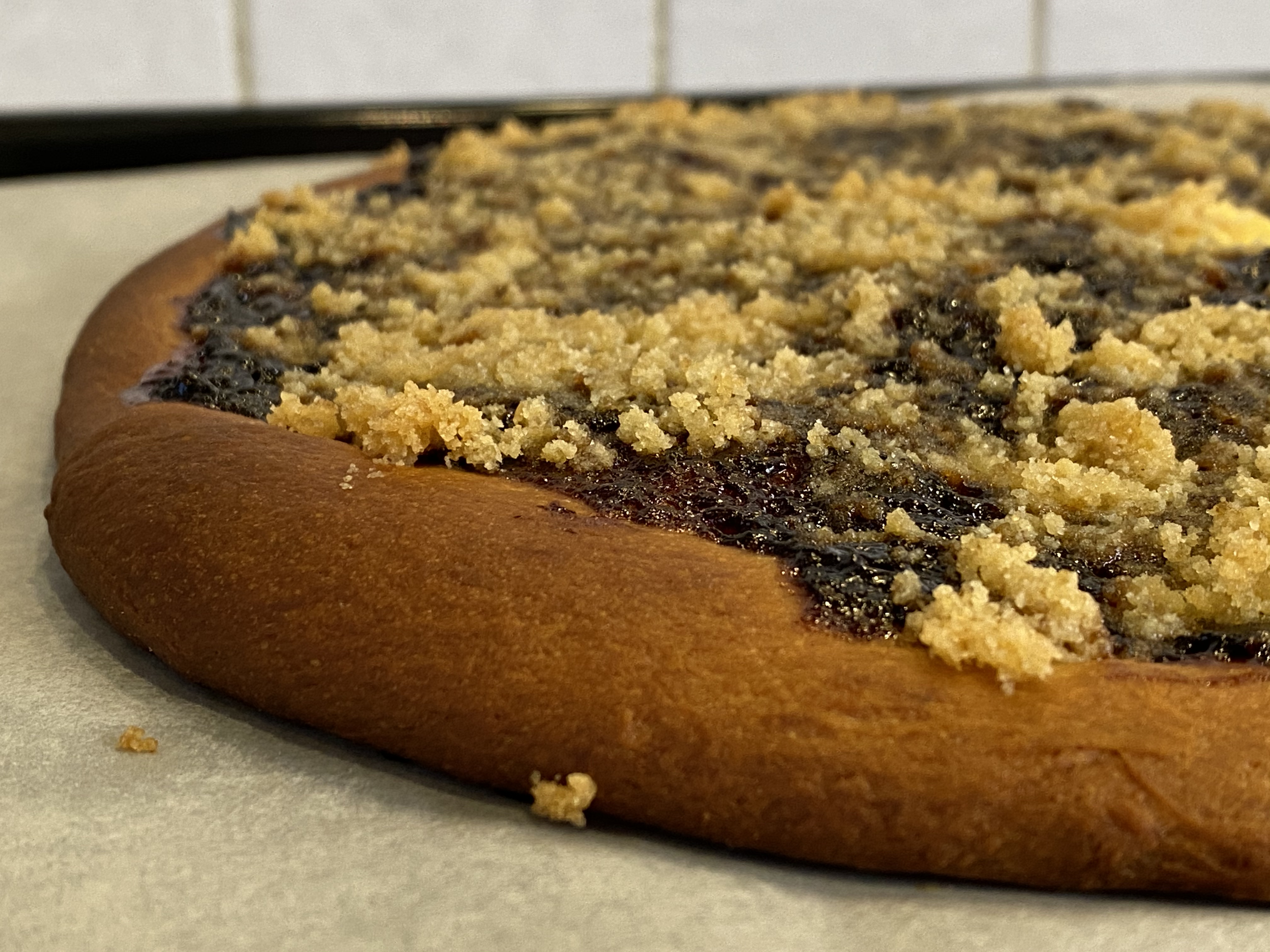 Ohřejeme mléko, přidáme lžičku cukru a kostrku droždí - necháme vzejít. Rozpustíme máslo. Promícháme cukr a mouku. Přidáme dva žloutky, máslo a mléko s droždím. Zaděláme těsto, necháme 40 minut kynout pod fólii.