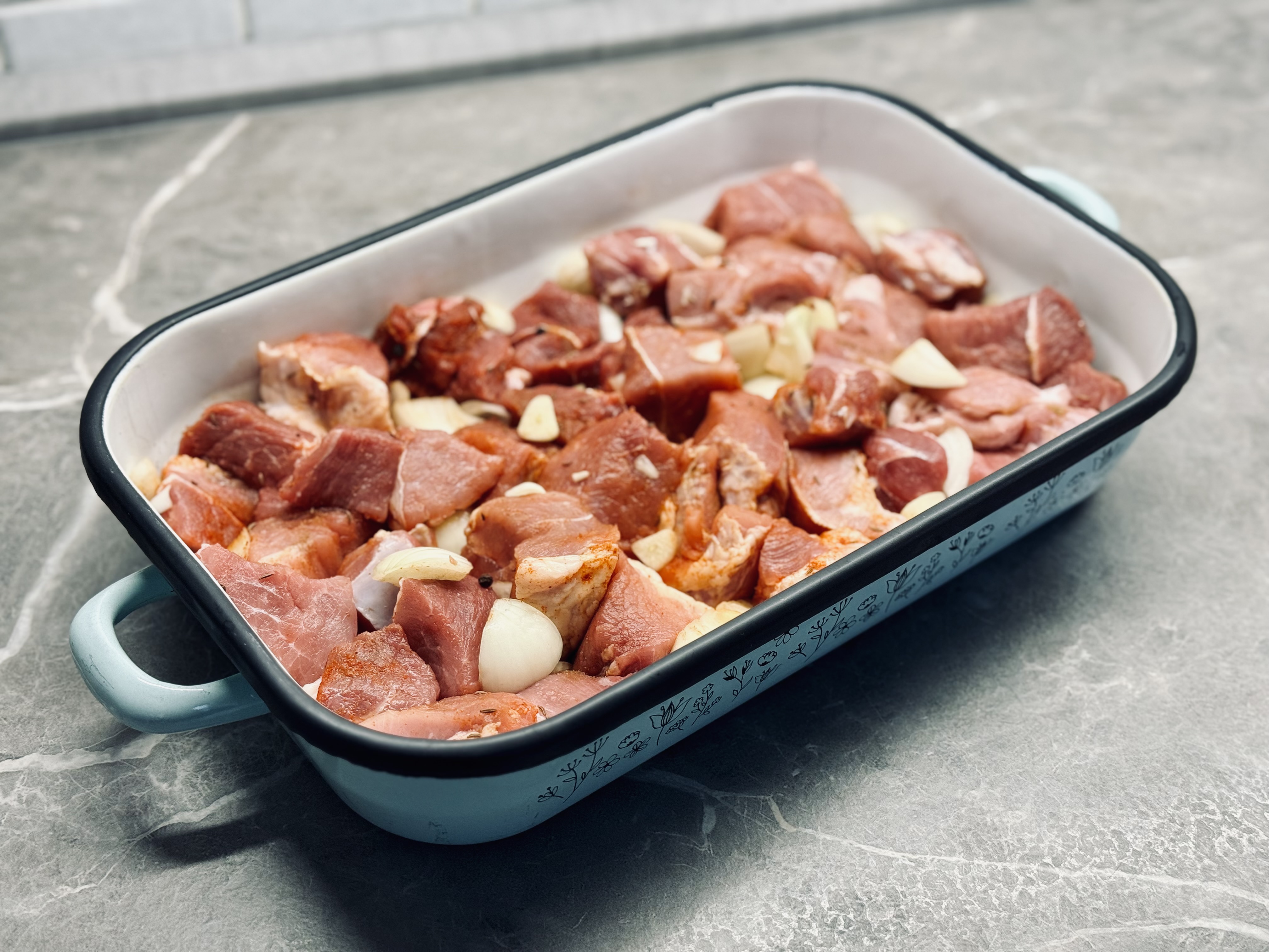Section titled “Příprava výpečků”- Maso nakrájíme na větší kostky a osolíme (na cca 1% tedy 6g soli na 600 g masa).